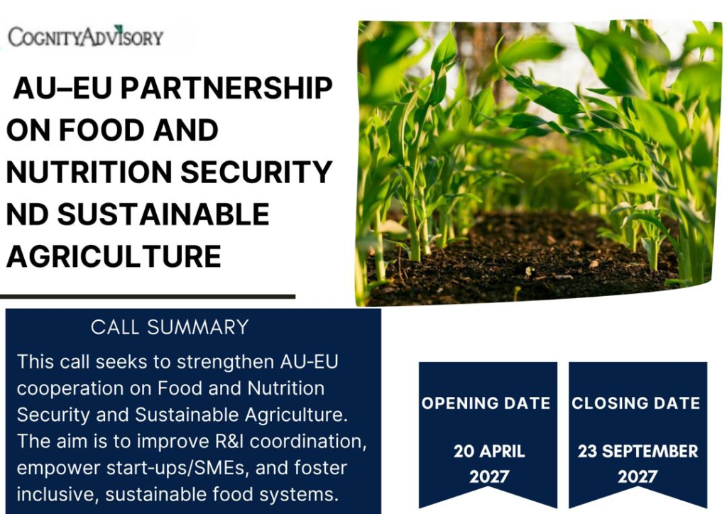 • provide a platform for funders and seed funding to further develop and/or scale-up technical and social innovations created by a previous HLPD-FNSSA[1] projects. These projects must have been funded in support of the EU-AU FNSSA roadmap 2016-2026 and funded by one of the instruments of EU-AU R&I collaboration, they include African Union Research Grants, ERA-Nets (Leap-Agri, FOSC), Horizon 2020, Horizon Europe and DeSira;