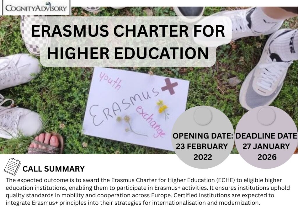 ERASMUS-EDU-2022-ECHE-CERT-FP General information Programme Erasmus+ (ERASMUS+) Call Erasmus Charter for Higher Education 2022 (ERASMUS-EDU-2022-ECHE-CERT) Type of action ERASMUS-CERT ERASMUS ECHE Charter Type of MGA ERASMUS Certificate [ERASMUS-CERT] Open For Submission Deadline model multiple cut-off Opening date 23 February 2022 Deadline dates 03 May 2022 17:00:00 Brussels time 26 January 2023 17:00:00 Brussels time 25 January […]