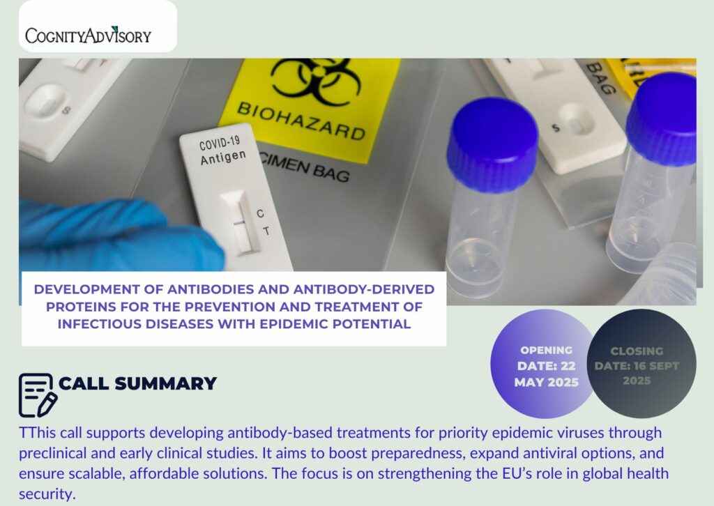 Proposals should exclusively pursue the development of existing antiviral and prophylactic and therapeutic candidates that are based on antibody and/or antibody-derived proteins targeting at least one of the priority viruses: